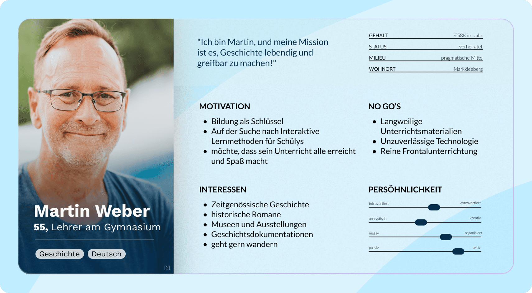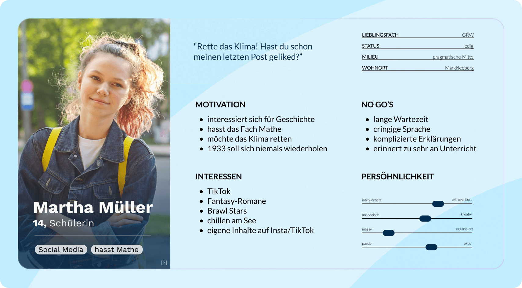 Bei der Entwicklung der drei Personas habe ich gezielt darauf geachtet, verschiedene Motivationsausprägungen abzubilden: Eine Persona mit stark intrinsischer Motivation, eine mit überwiegend extrinsischer Motivation und eine, die sich dazwischen bewegt. Hierzu habe ich sowohl quantitative Umfragedaten als auch qualitative Interviewerkenntnisse herangezogen.