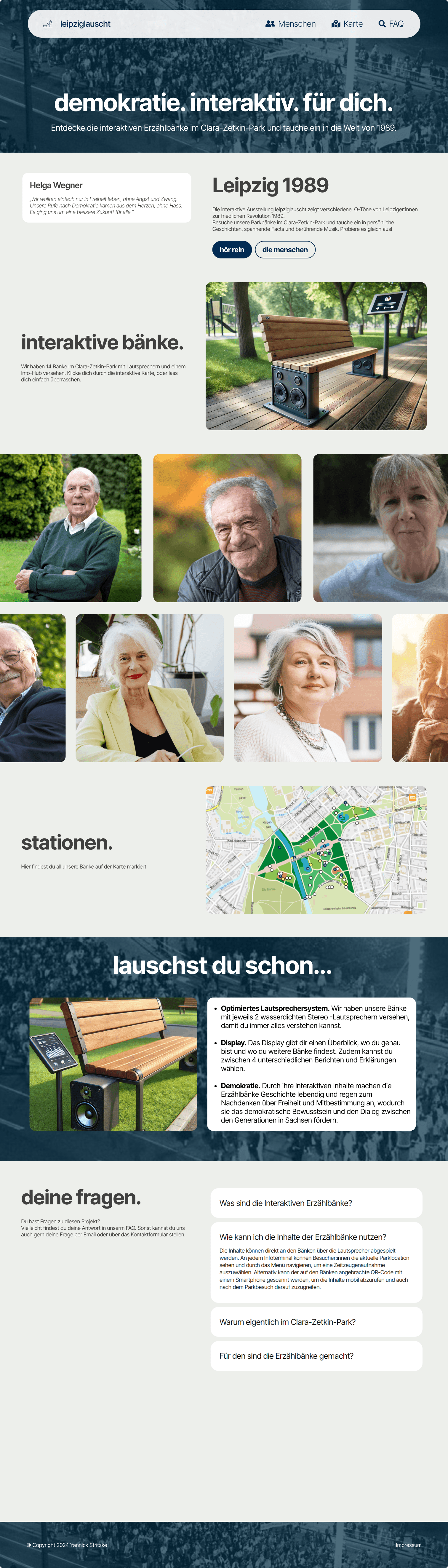 Für mein Projekt „leipziglauscht“ habe ich eine interaktive Anwendung für den Clara Park in Leipzig entwickelt, die Besucher spielerisch für demokratische Werte sensibilisiert. Nach kreativen Ideen wie digitalen Graffiti, Naturpfaden und musikalischen Wegen fiel die Entscheidung auf interaktive Erzählbänke. Diese Bänke erzählen persönliche Geschichten zur friedlichen Revolution in Leipzig und vermitteln Informationen über Lautsprecher, QR-Codes und Bildschirme – eine ruhige, einladende Lösung, die zum Innehalten und Reflektieren anregt.