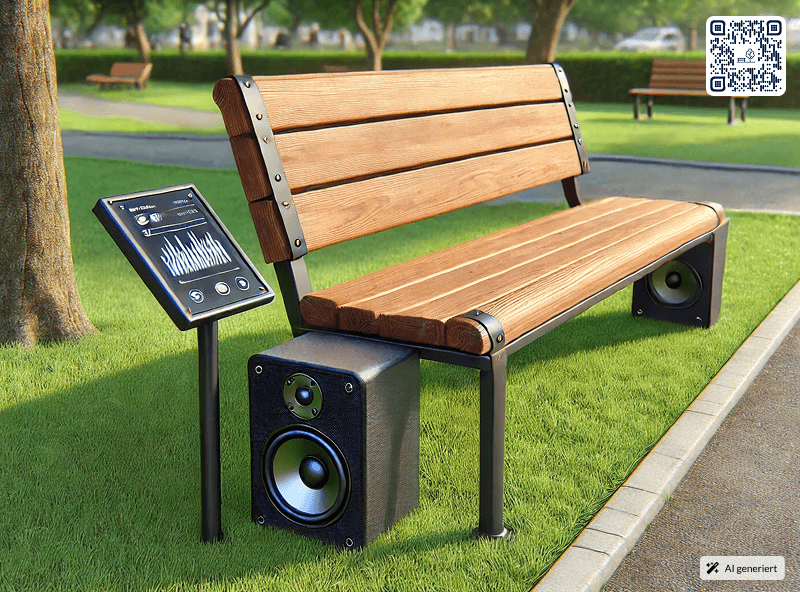 Die Idee hinter den „Interaktiven Erzählbänken“ im Clara-Zetkin-Park ist es, bestehende Parkbänke durch die Installation von Lautsprechern und Infoterminals in interaktive Erlebnispunkte zu verwandeln. An jedem Infoterminal können Besucher:innen ihre aktuelle Position im Park erkennen und eine Aufnahme einer Zeitzeugin der friedlichen Revolution über die Lautsprecher abspielen lassen. Zusätzlich bietet der Informationsbildschirm weiterführende Fakten und Hintergrundinformationen, die die Audioaufnahme ergänzen und vertiefen. Um den Zugang zu den Inhalten flexibel zu gestalten, befindet sich auf jeder Bank ein QR-Code, der es ermöglicht, die Aufnahmen und zusätzlichen Informationen auch mit dem Smartphone abzurufen. Eine passende Demo habe ich auf leipziglauscht.space erstellt. Probiere die Seite gern aus, indem du den QR Code scannst, oder auf den Link klickst. So können Besucher:innen die Inhalte unabhängig von der Bank erleben und mit nach Hause nehmen, um sich auch später noch mit der Geschichte der friedlichen Revolution auseinanderzusetzen.